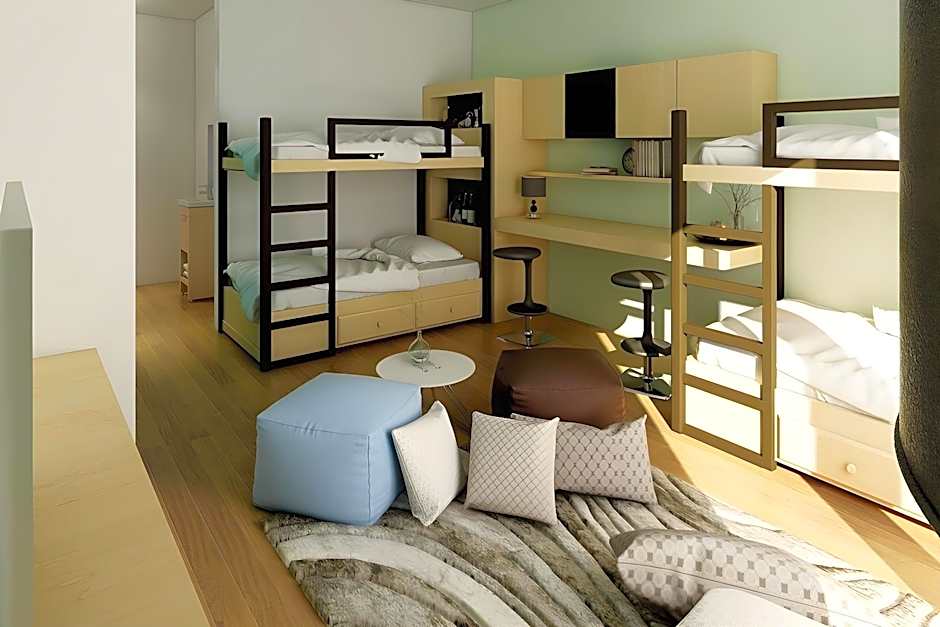 FAMILY is 398 square feet and includes either a queen-size bed 150-154 width or bunk beds.